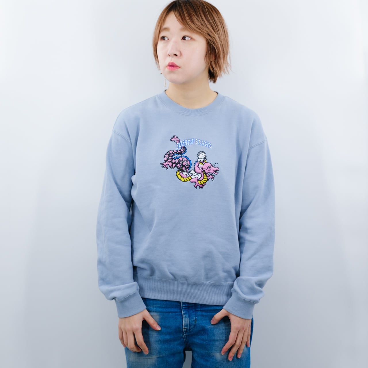 龍神とBUDDHA (刺繍) 仏像 トレーナー 水色 10.0oz