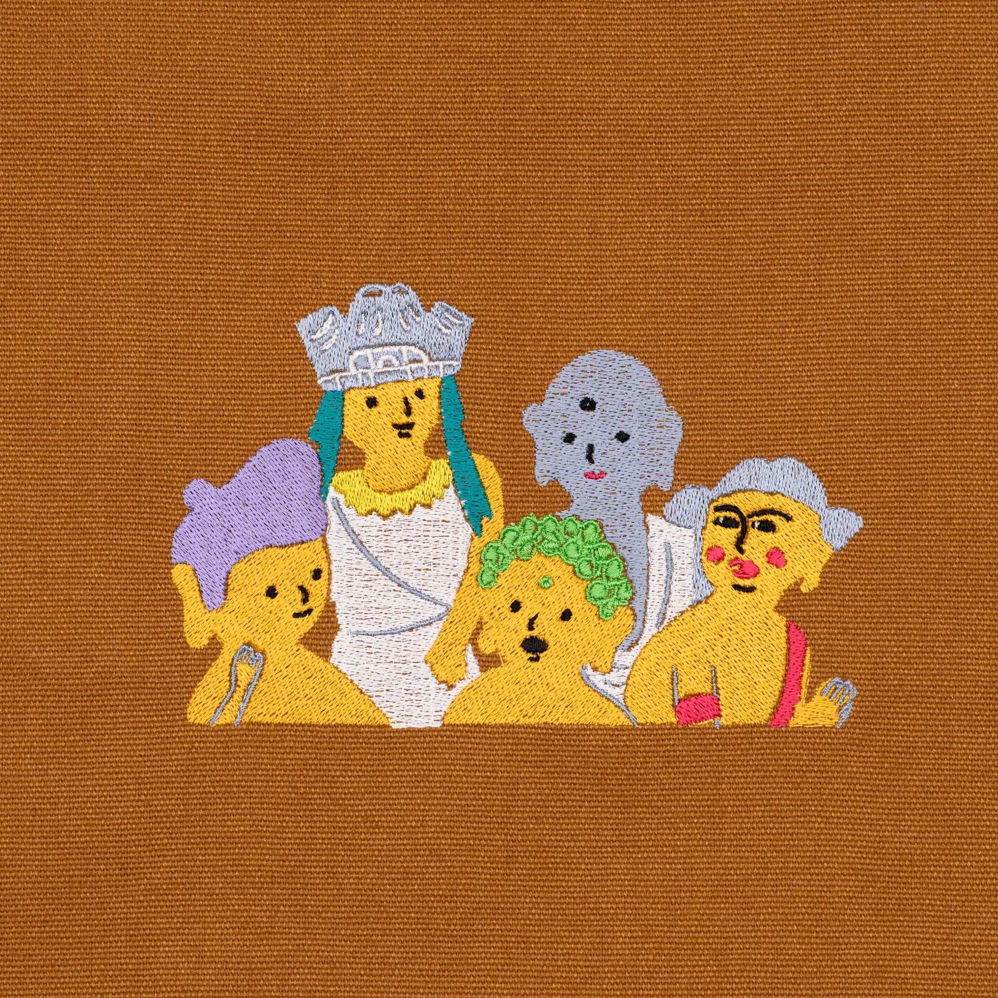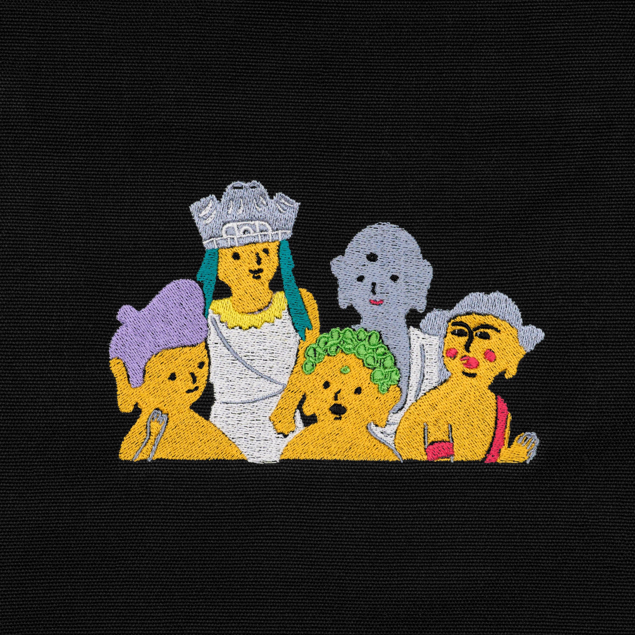 弥勒菩薩、BUDDHA、善財童子、百済観音、地蔵菩薩が一枚の集合写真に集まったのを刺繍ライクでおこしたデザイン。