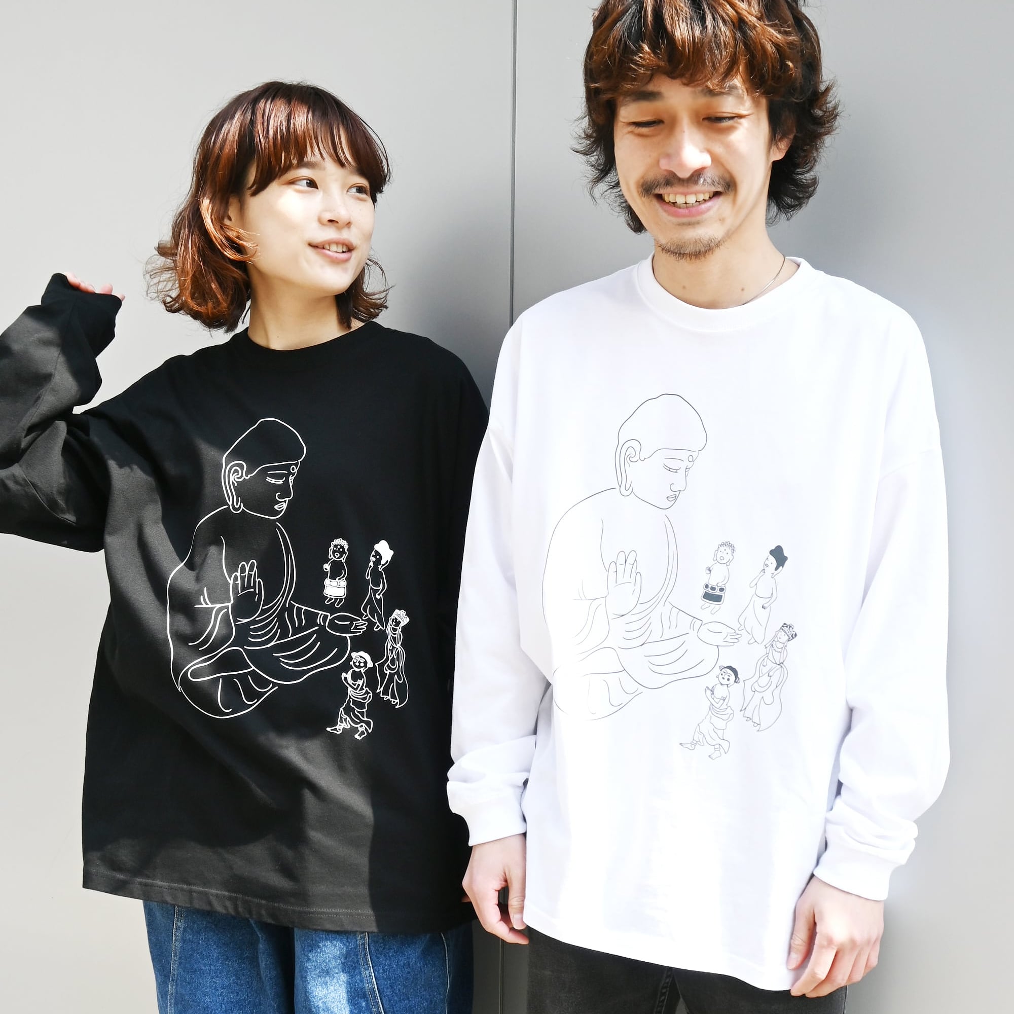 東大寺大仏殿に、もう何回行っても毎回底から湧きあがってくる感動と驚きをデザインした【空即ジェネレーション】。お店の愛され仏像キャラクターたちの初めての大仏拝観の瞬間です。このデザインの名前は公募でお名前を決めてもらいました。