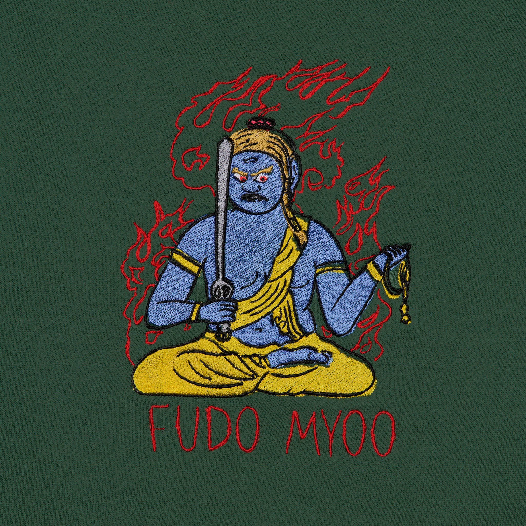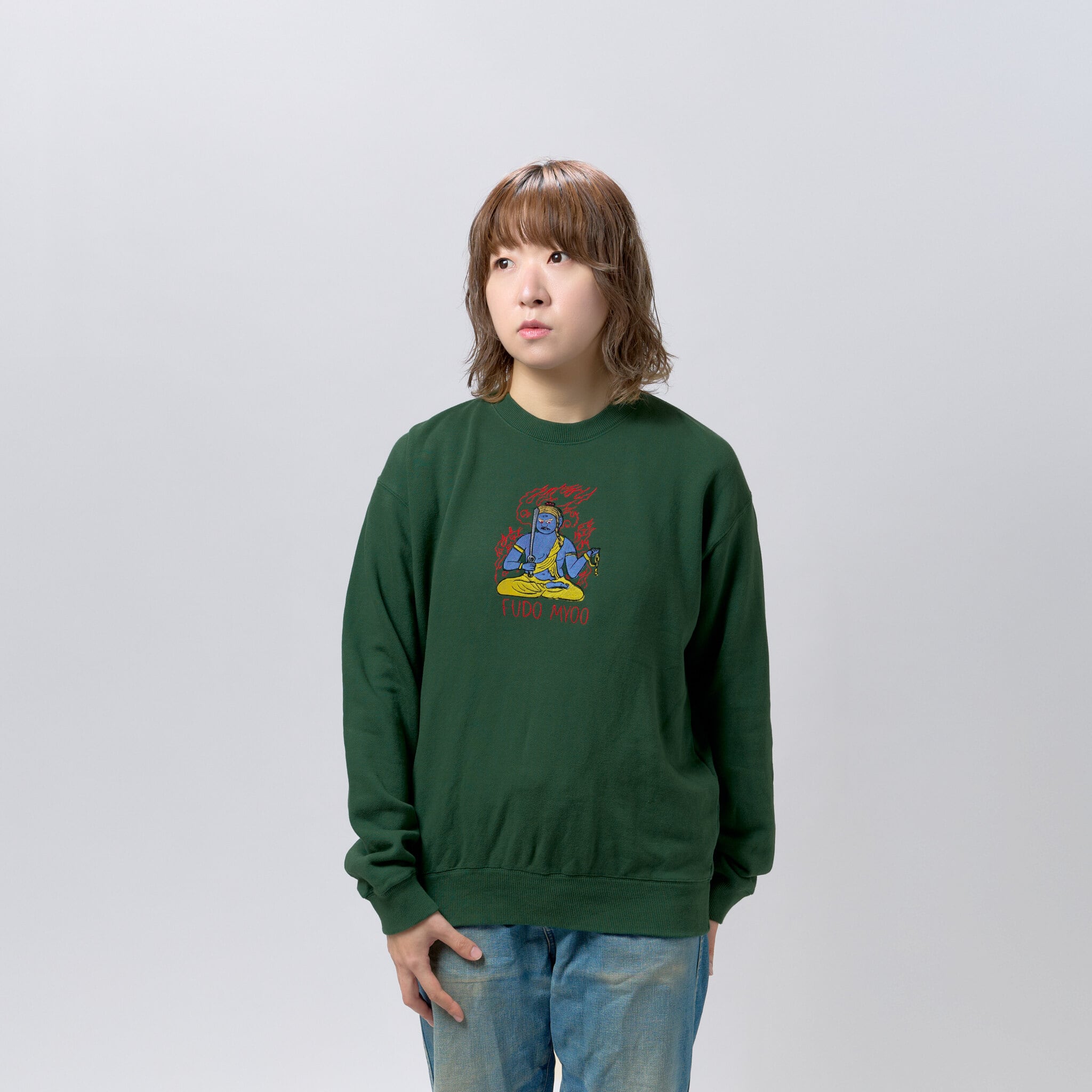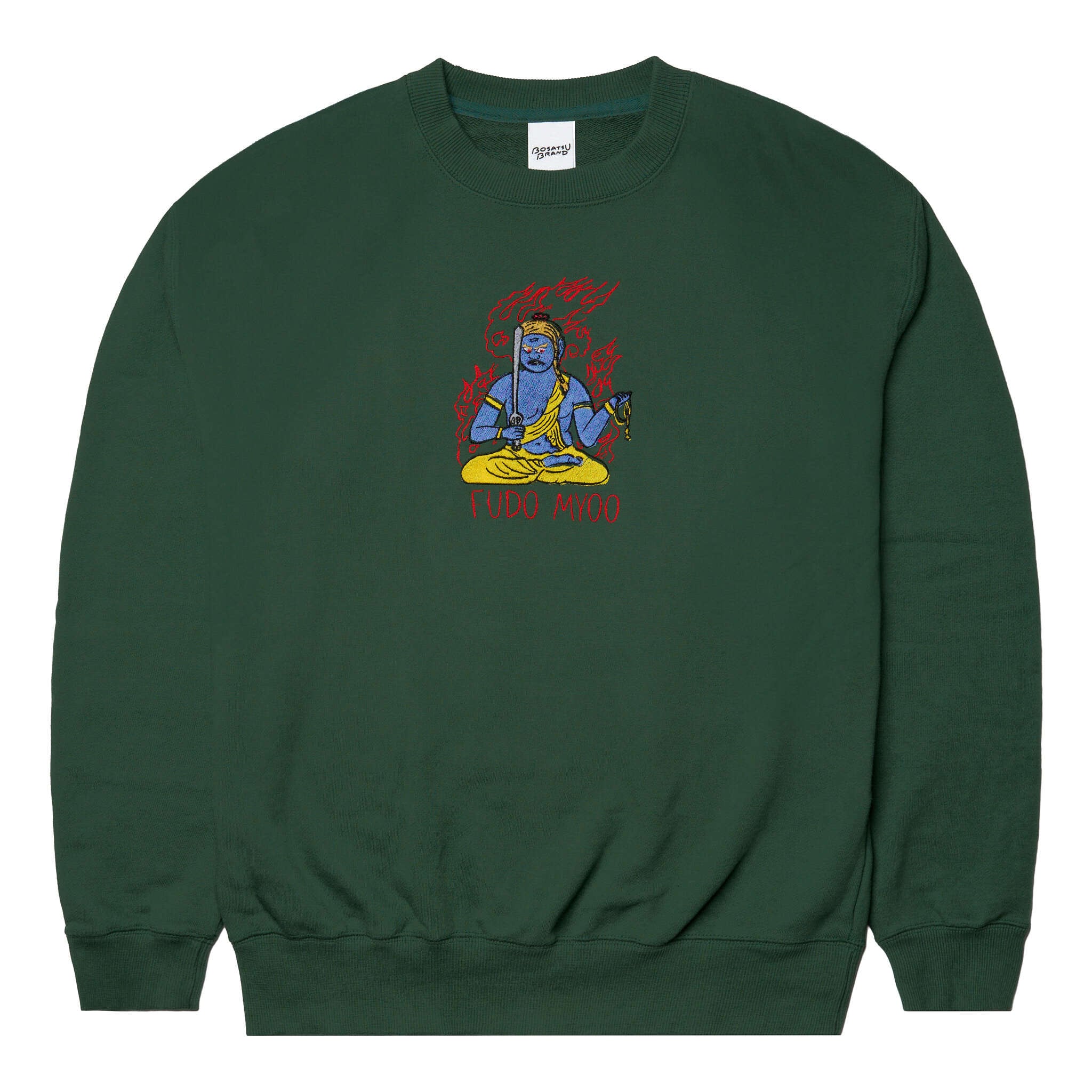 不動明王 仏像 トレーナー (刺繍) 10.0oz ブラック/グレー/アイビーグリーン
